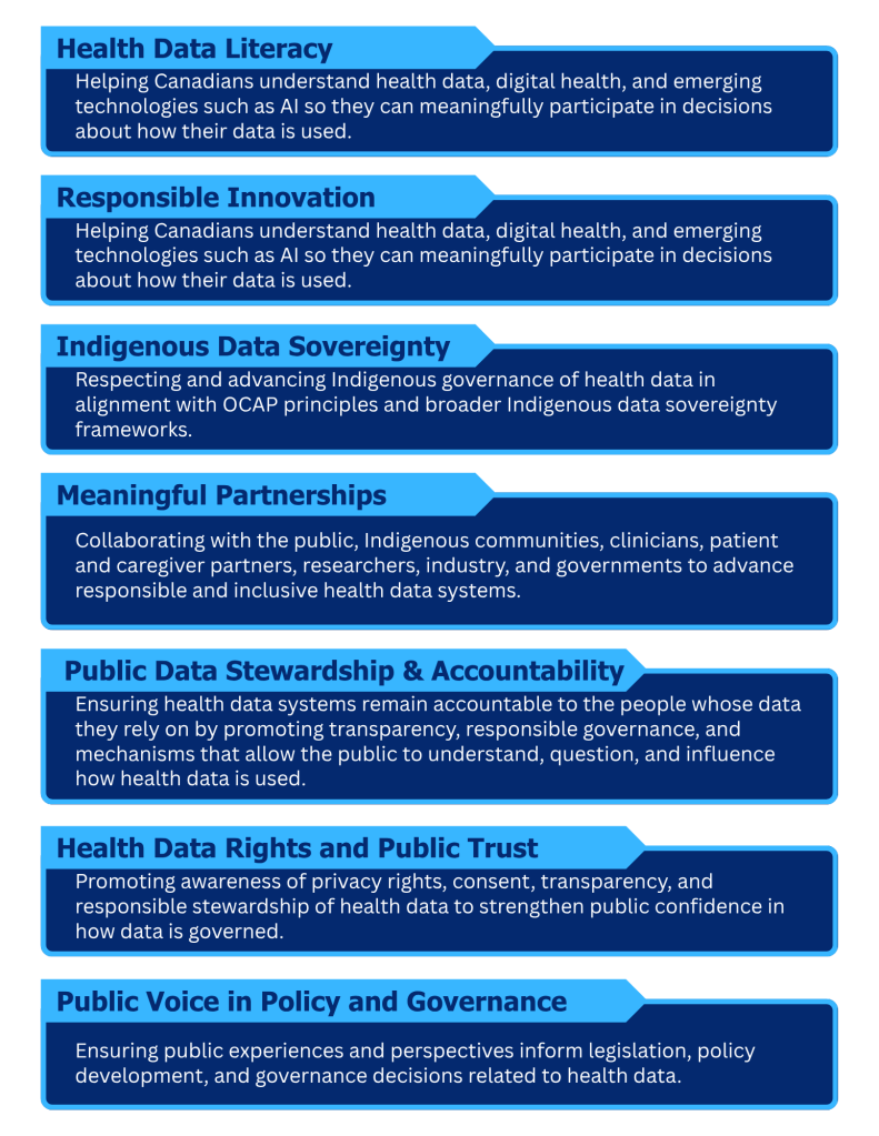 To empower Canadians to understand, shape, and influence how health data is collected, governed, accessed, and used to:
